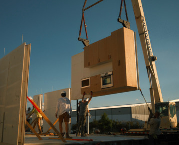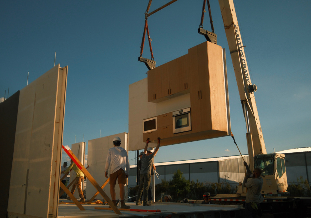 Each component of the building system is designed to fit in intermodal shipping containers, enabling low-cost shipping to any site in the country.